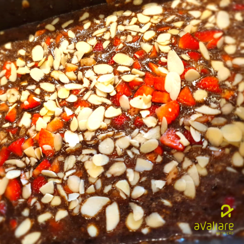 untada e polvilhe os morangos e as lascas de amêndoas por cima. Prontinho, é só